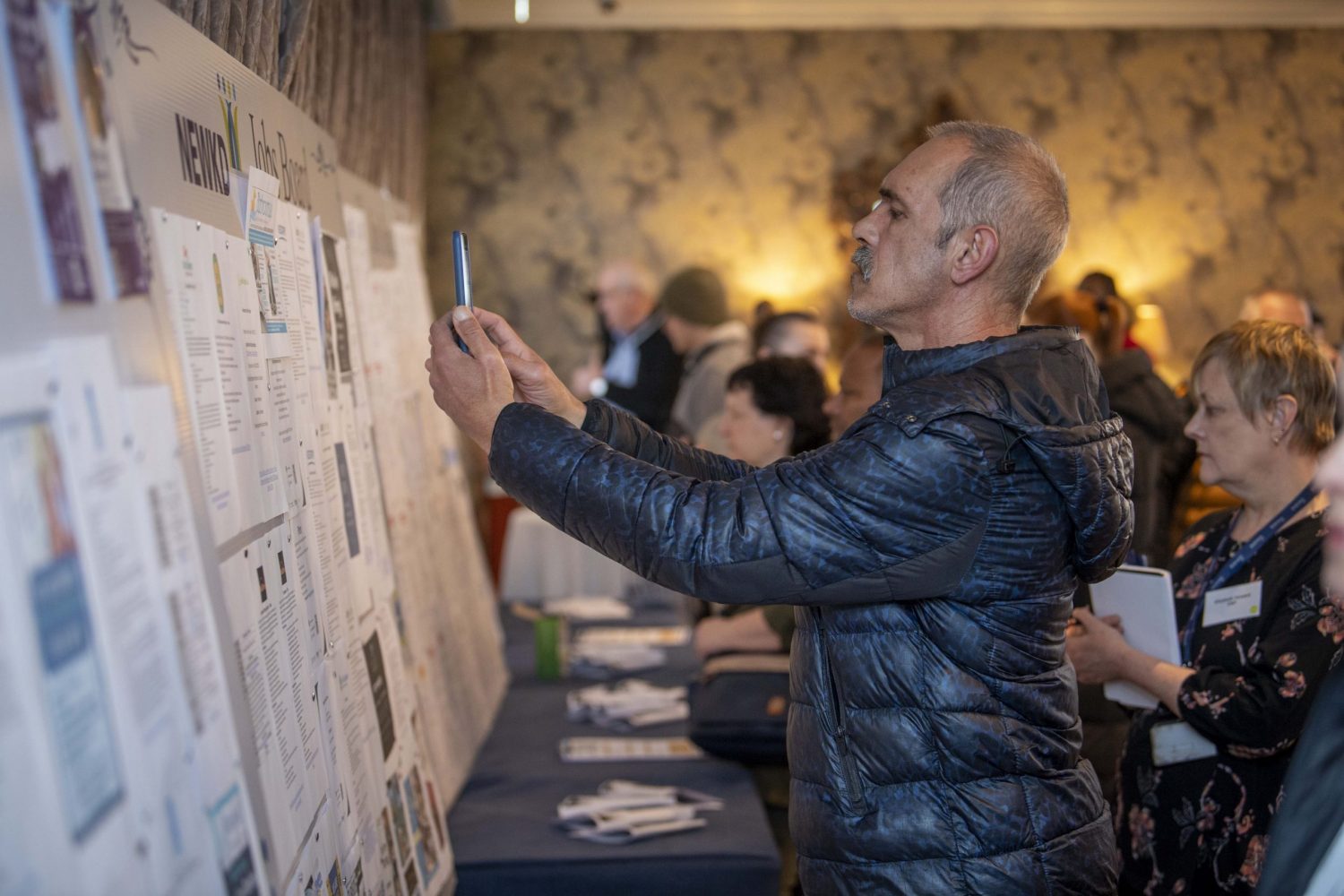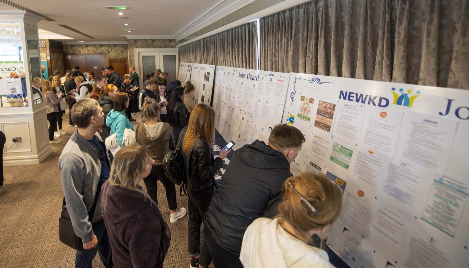 A jobs wall with over 200 jobs ready to start , was set up for job seekers by the local NEWKD on the day . The wall was was packed with people looking for work .