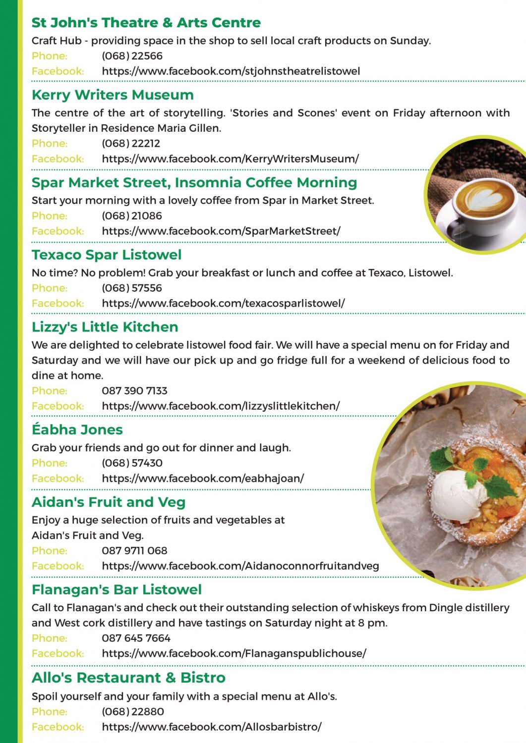 Pick up some local produce in one of our fabulous shops, order a food from one of our fab takeaways. Arrange to meet some friends for a coffee in one of our amazing coffee shops, buy a new cook book in one of our incredible bookshops. Get the family together and go out for a meal in one of our many excellent restaurants. Whatever you do this weekend, do it in Listowel.