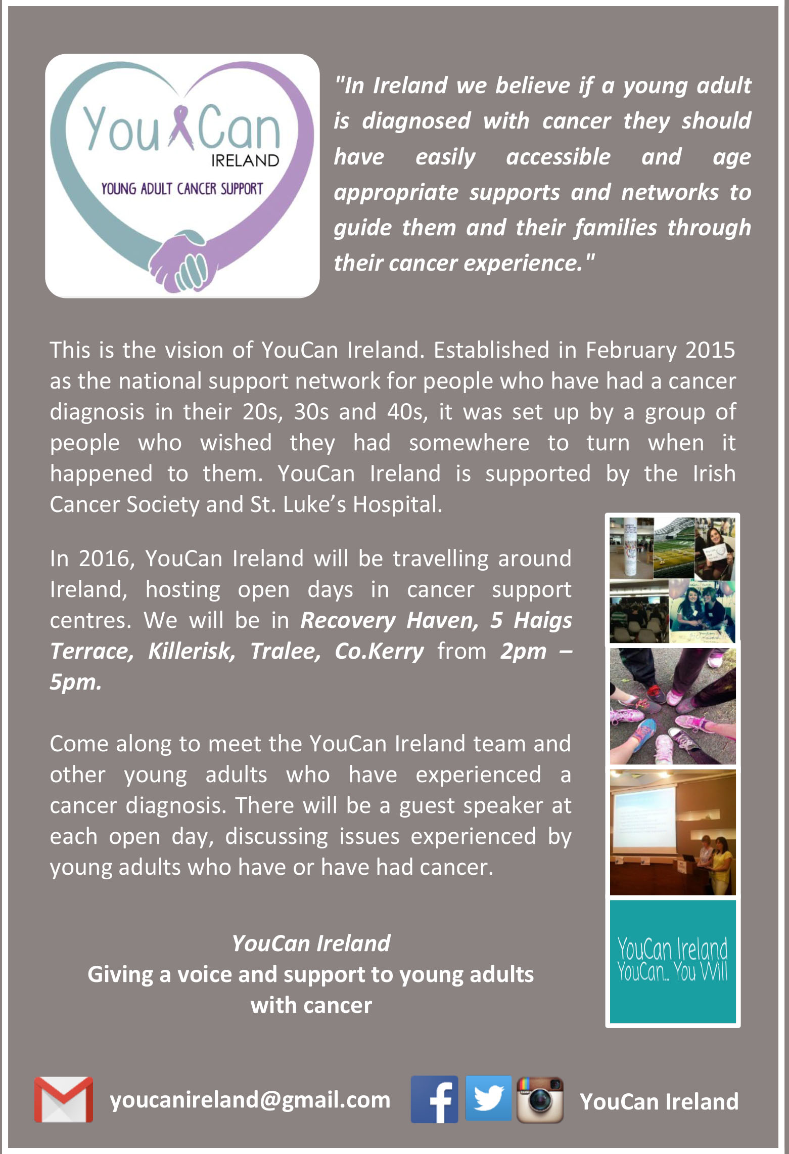 As we are a nationwide support network and want to be accessible to young adults in all parts of the country, YouCan Ireland is travelling around Ireland, hosting open days in cancer support centres nationwide during 2016. We will be hosting our next open day in Recovery Haven, 5 Haigs Terrace, Killerisk, Tralee, Co.Kerry on Saturday August 13th, 2016 from 2pm-5pm. There will be a guest speaker, discussing issues experienced by young adults who have or have had cancer. It will also be an opportunity to meet the YouCan Ireland team and other young adults who have experienced a cancer diagnosis. All of the YouCan Ireland team know what it is like to receive a cancer diagnosis. We have been in the position of having cancer as someone in their 20s, 30s or 40s.